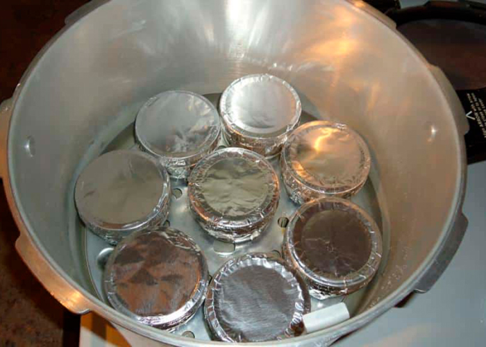 Теперь пришло время стерилизации с помощью пара. Плотно закрутите крышки и накройте посуду оловянной фольгой. Обязательно закрепите края фольги по бокам, чтобы предотвратить проникновение конденсата.
